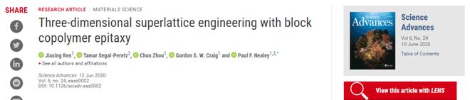 對(duì)原子和分子晶格結(jié)構(gòu)的控制是材料科學(xué)領(lǐng)域研究的永恒課題。眾所周知,嵌段共聚物(BCP)是由不同化學(xué)性質(zhì)的聚合物通過(guò)共價(jià)鍵結(jié)合在一起的大分子,基于不同嵌段化學(xué)性質(zhì)和體積分?jǐn)?shù)的差異,BCP在納米尺度上通過(guò)自組裝可以形成多種微結(jié)構(gòu)(如層狀、螺旋狀、圓柱體和球體等)。