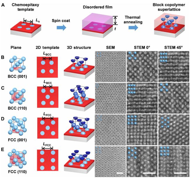 圖1. 控制BCP超晶格的對(duì)稱性和方向性。(A)化學(xué)外延法工藝流程示意圖,采用光刻制備2D模板,將BCP旋涂到模板上,熱退火使BCP定向自組裝(DSA)為3D超晶格結(jié)構(gòu);(B-E)不同模板圖案上的三層 PS-b-PMMA膠束的化學(xué)外延:BCC(001),BCC(110),面心立方(FCC)(001)和FCC(110)。每一行從左到右分別為:晶胞,模板的2D結(jié)構(gòu),模板上組裝晶格的3D結(jié)構(gòu),自頂向下的掃描電子顯微鏡(SEM),以及在0°和45°拍攝的自組裝薄膜的STEM圖像,不同層上的PMMA核層為藍(lán)色,比例尺00 nm。