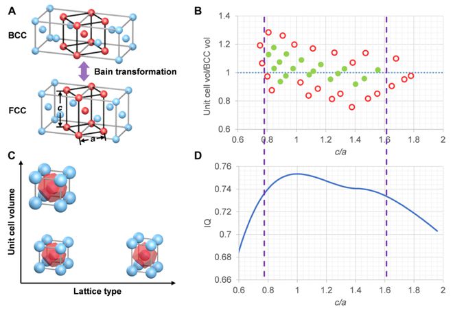 研究者將描述晶格類型的c/a參數(shù)與歸一化晶胞體積進(jìn)行了關(guān)聯(lián),發(fā)現(xiàn)當(dāng)c/a在0.81~1.56范圍內(nèi)時(shí),都能得到完美的微結(jié)構(gòu)(綠色實(shí)心圓),說(shuō)明BCC到FCC可以沿著B(niǎo)ain路徑連續(xù)變化;在此范圍外,結(jié)構(gòu)有序性則較差(紅色空心圓圈)。