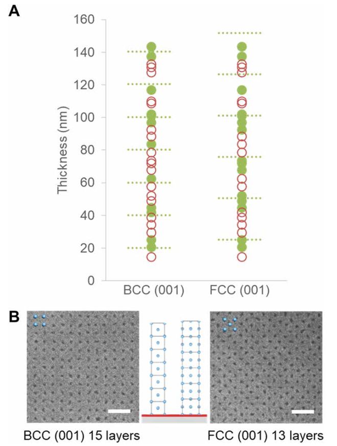 當(dāng)BCP薄膜厚度與相應(yīng)模板的層間距不匹配時(shí),很難生長(zhǎng)出厚的有序薄膜;當(dāng)兩者相匹配時(shí),BCC(001)和FCC(001)都能以完美的結(jié)構(gòu)排列出283.9 nm厚的薄膜,證明了這種方法能夠精確地控制距離模板數(shù)百納米外膠束的位置,對(duì)于BCC(001)和FCC(001)來(lái)說(shuō),該厚度分別相當(dāng)于15和13層膠束。