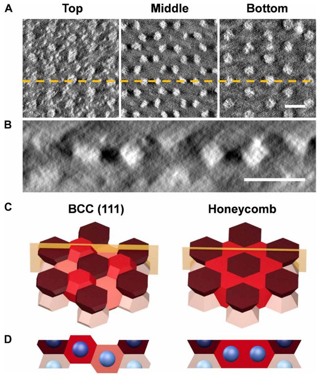 實(shí)際上,STEM斷層掃描顯示該薄膜由三層膠束組成:蜂窩狀的中心層夾在頂部和底部的六角形膠束之間,頂部和底部的膠束中PMMA核位于蜂窩層六元環(huán)的中心。這種獨(dú)特的混合結(jié)構(gòu)與四層膠束結(jié)構(gòu)不同,雖然頂部和底部相同,但是BCC晶格的兩個(gè)中間層“合并”為一層蜂窩狀晶格。